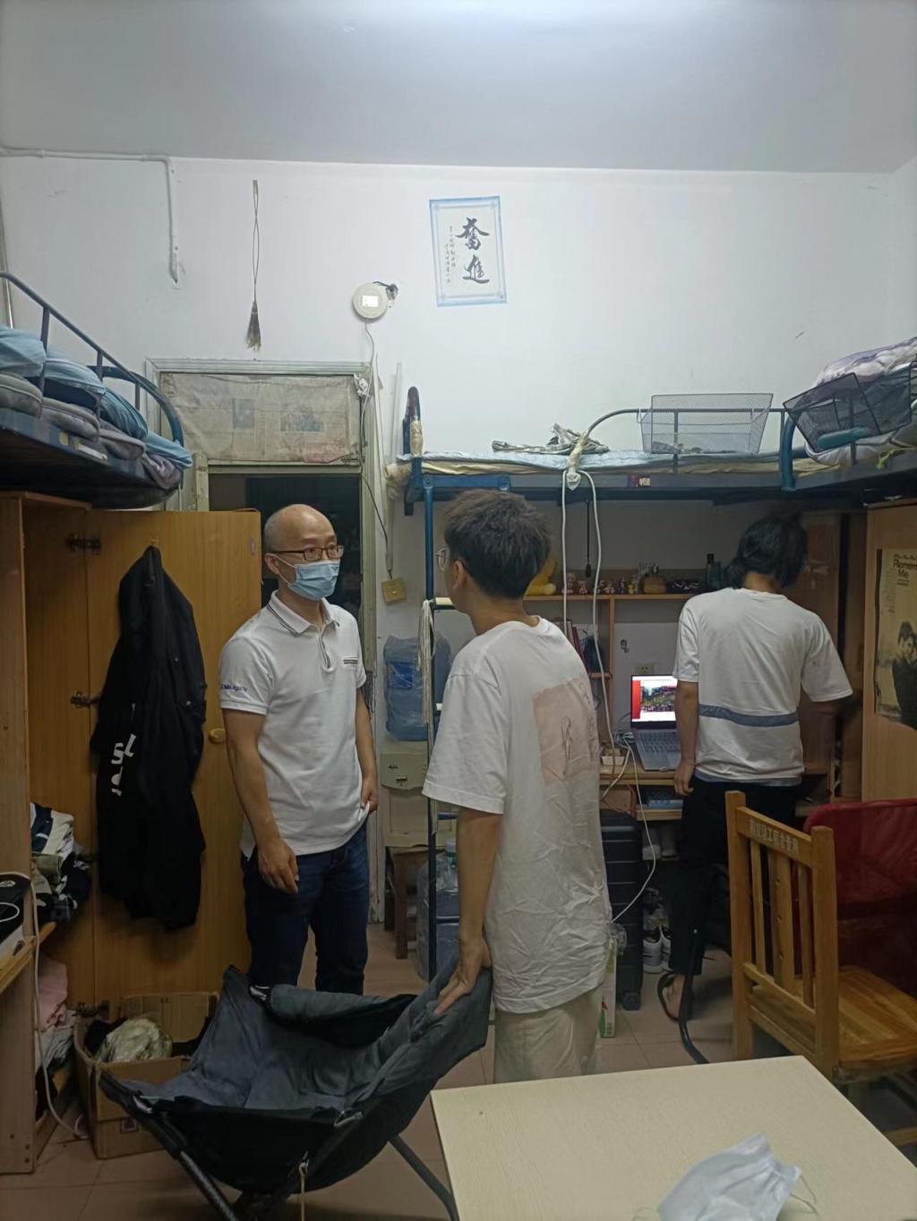 为做好公司疫情防控工作,压实疫情防控责任,确保秋季正常开学。2022年9月1日晚,公司党总支书记赵德军、经理刘诺亚对公司员工宿舍进行走访慰问检查,副书记王玥、副经理吴晓凤、学工办主任郭永彬及全体辅导员参加检查。