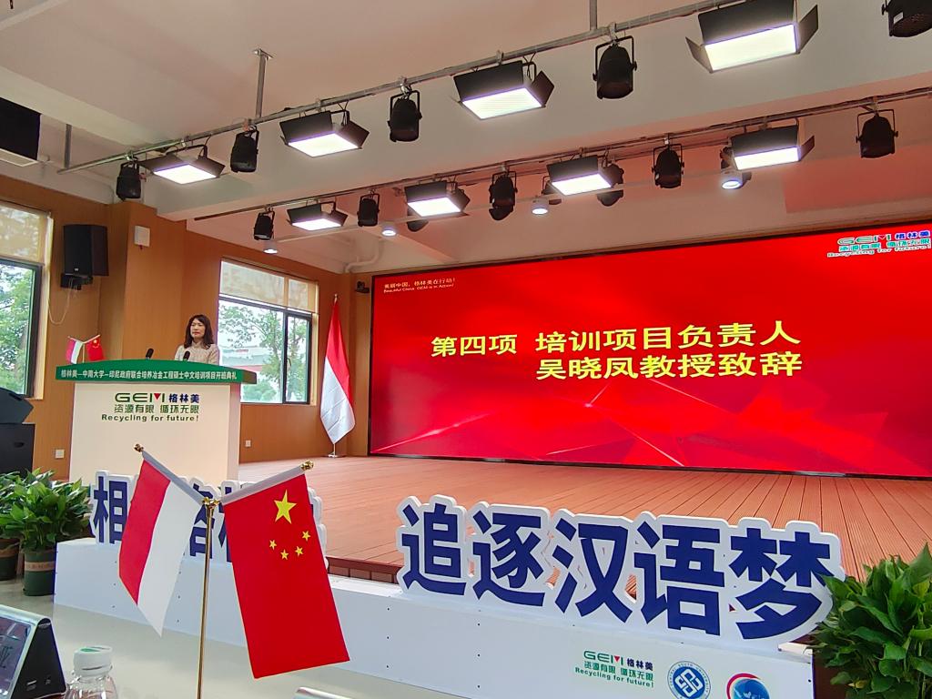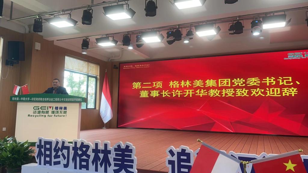 典礼上,在播放格林美和印尼政府联合举办冶金工程硕士班运营情况,及格林美公司宣传视频之后,许开华董事长发表讲话,他热烈欢迎印尼硕士班员工到格林美学习和体验,勉励印尼员工要为学好冶金和新能源知识而学习中文,要为推动中印尼友好合作交流而学习中文,为更好推动两国文化、科技交流学习中文,为传播中国环保理念,推广绿色循环文化而学习中文。