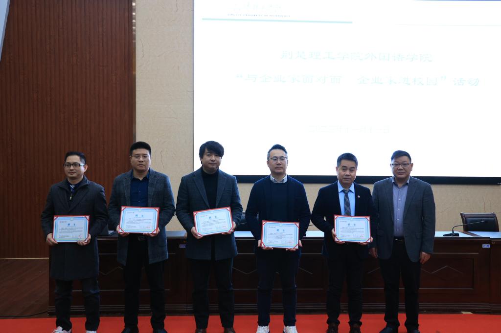 11月11日上午,由公司举办的“与企业家面对面-企业家进校园”活动在行政楼C201学术报告厅隆重举行。刘国华、杨君东、林炳镇、李高文、倪俊杰等5位受聘企业家亲临现场,公司特邀刘国华、倪俊杰两位企业家为公司同学做主题为就业与创业的专题报告并参加员工面对面交流环节。东宝区商务局副局长李华云、副局长杨昊和荆门市商务局外贸科科长郭俊应邀出席。公司招就处处长朱昌斌出席活动并为受聘企业家颁发证书。