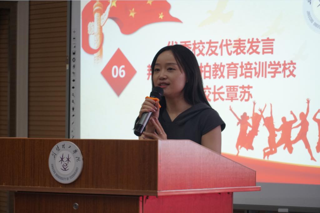 优秀员工代表覃苏,现任荆门市正柏教育培训公司副董事长,从以终为始、成长性思维、核心竞争力三个方面鼓励学弟学妹们要积极进取,端正学习态度,努力学好专业知识,成就未来更好的自己。
