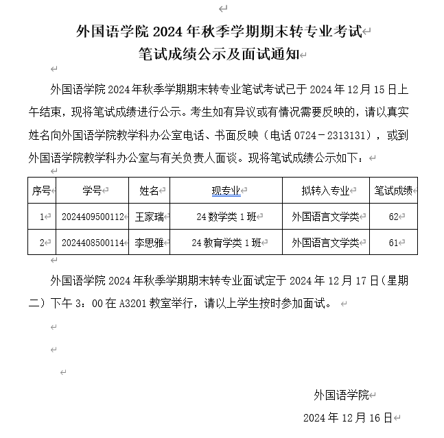 伟德中国官网入口2024年秋季学期期末转专业考试 笔试成绩公示及面试通知