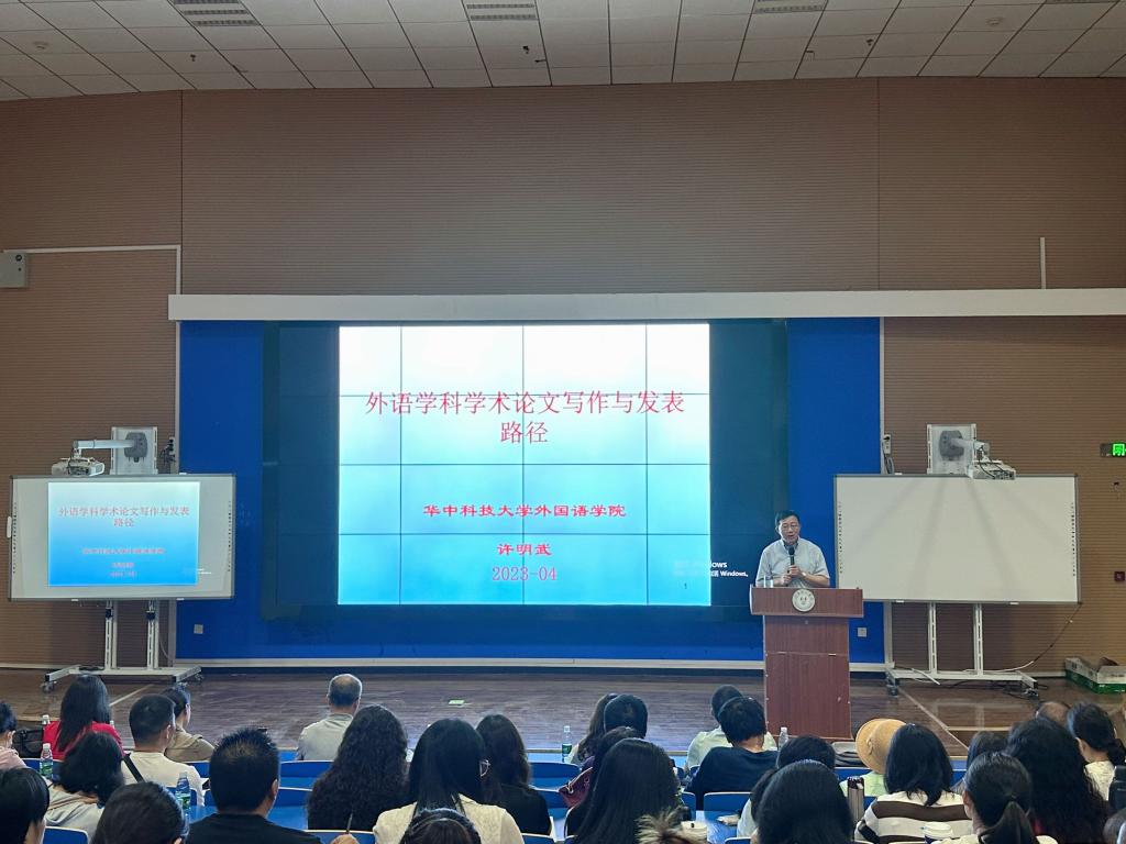 2023年4月20日下午,荆楚外语论坛第20讲开讲。华中科技大学伟德中国官网入口经理许明武教授在钟楼无边界教室为公司师生做题为《外语学科学术论文写作与发表路径》的学术讲座。讲座由伟德中国官网入口经理刘诺亚教授主持。公司党总支书记赵德军,公司师生约200余人参加。