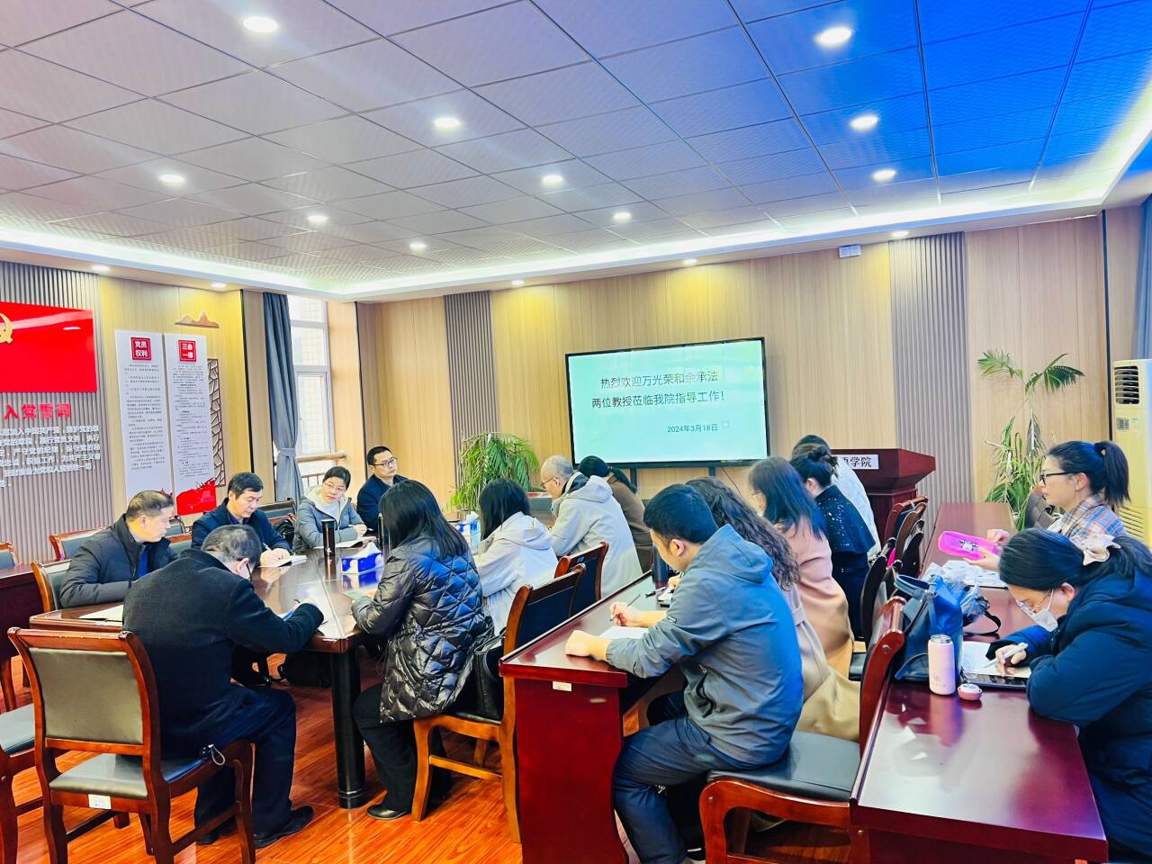 在座谈环节,万光荣、余承法教授与公司教师就2024年度科研申报项目本子的修改和科研选题等方面进行面对面指导交流。