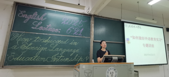 6月21日上午,A2205 教室座无虚席,2022 级英语专业及 2024 级英语(专升本)百余名员工齐聚一堂,共同聆听湖北 “楚天名师”、全国十佳初中外语教师、荆门市外语公司英语教研组长杨新征老师带来的“鼎力架起语言之桥,同心共育教育新苗”主题讲座。讲座中,杨老师结合丰富的一线教学经验,深入解析教育实习要点,现场互动频频,不时响起热烈掌声。此次活动由英语专业负责人罗倩主持,英语系主任何琳玲、毕业年级辅导员及学业导师代表到场一同聆听讲座。公司党委副书记王玥出席。