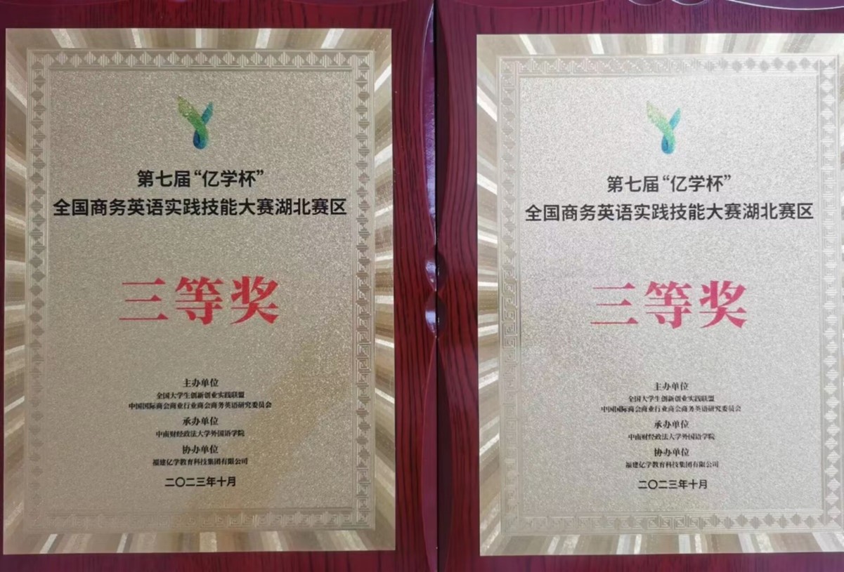 经过6个月的赛前训练和准备、线下答题和现场演讲比赛的激烈角逐,由公司王娇艳和罗颖两位老师指导和带队,21级商务英语系的两支参赛队伍最终凭借精彩的表现获得湖北省赛区三等奖的成绩。