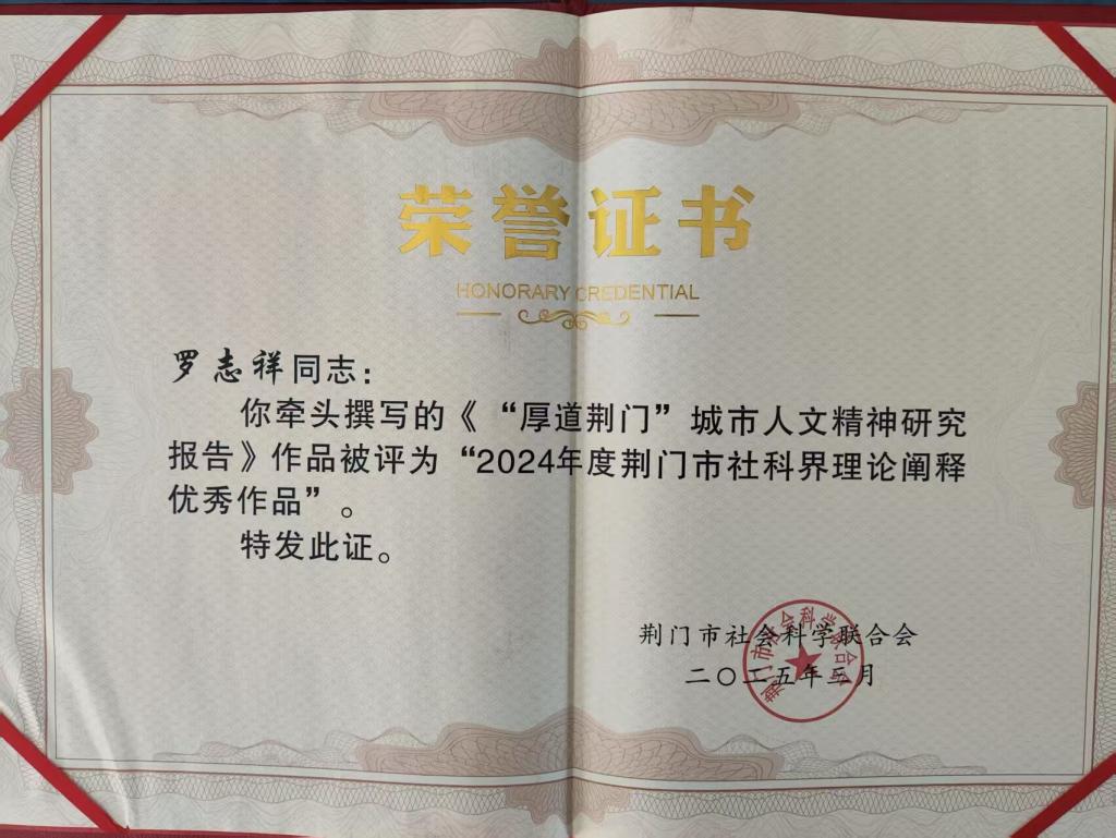 公司罗志祥博士撰写的“厚道荆门城市人文精神研究报告”获的荆门市委书记批示。该成果获得由荆门市社会科学联合会组织评比的“2024年度荆门市社科界理论阐释优秀作品”。